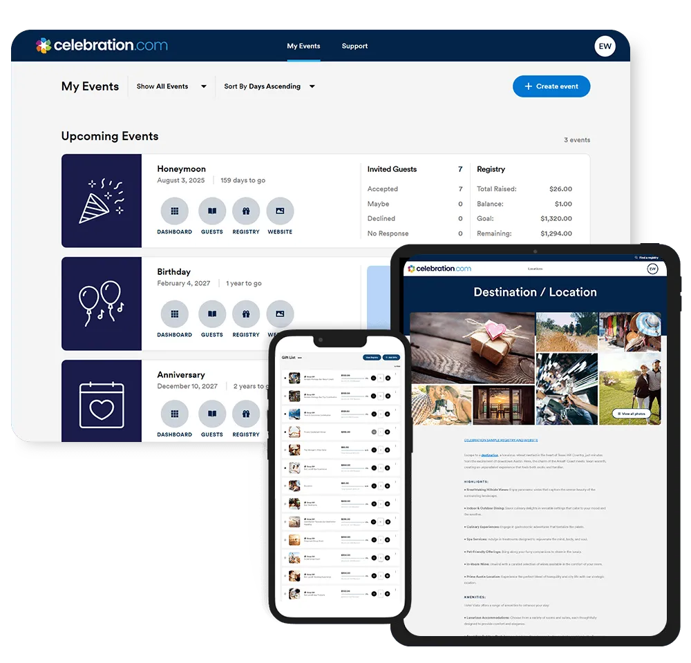Distribute event invitations traditionally or virtually. Share your event website with friends and family to receive registry contributions!